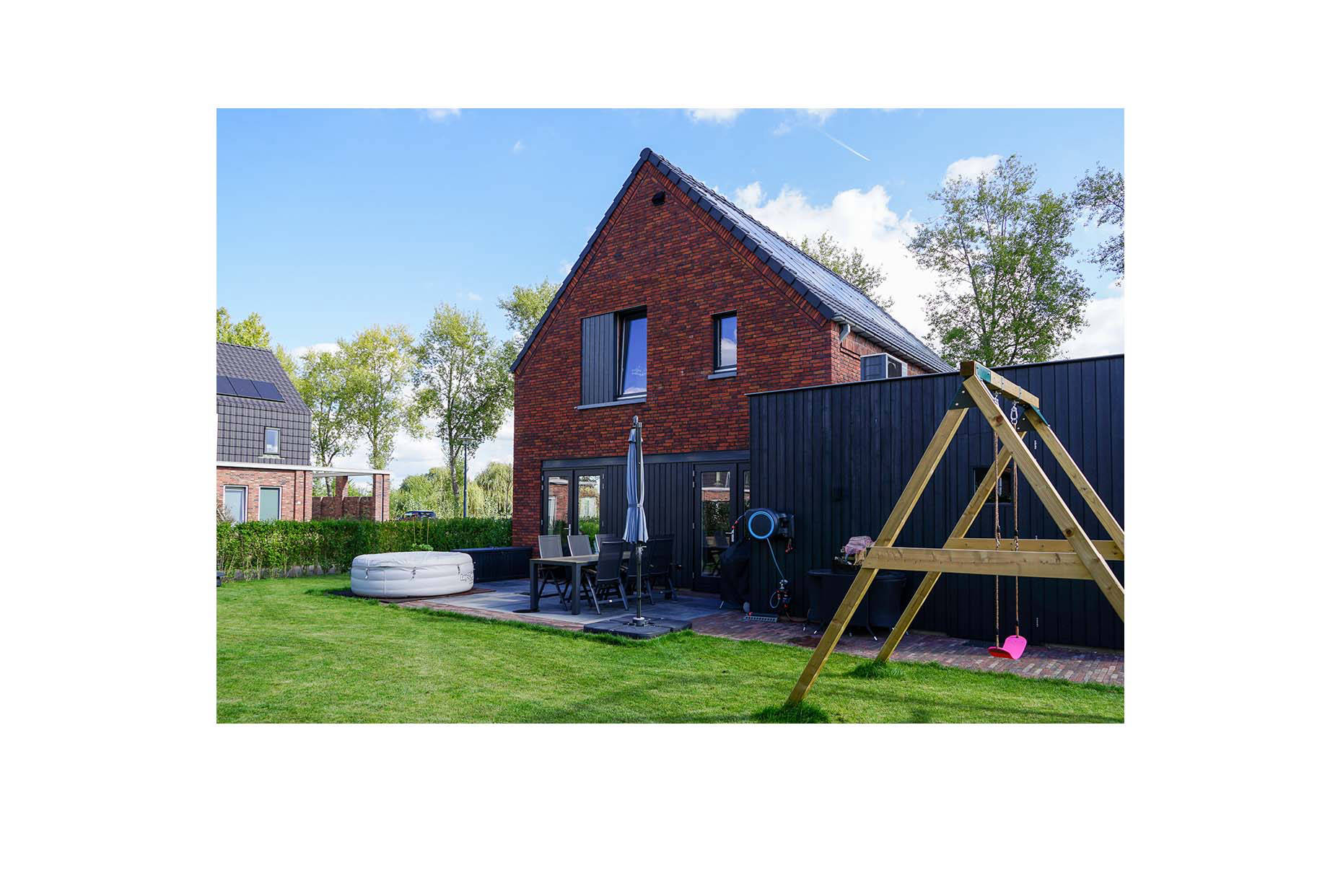 Deze woning staat in het buurtschap Kloostertuinen in Veghels Buiten. Traditionele materialen als steen, hout en pannen. Met daarbij een zadeldak en platte aanbouw lijkt de woning een traditioneel uiterlijk te hebben. Toch ziet de woning er anders uit dan in een gemiddelde woonwijk. In de Kloostertuinen moeten alle woningen op 1 of andere manier aansluiten bij de suggestieve gedachte dat het om bijgebouwen bij een klooster gaat.